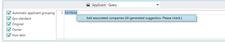 In the applicant search, associated companies can be added using AI for a given spelling.